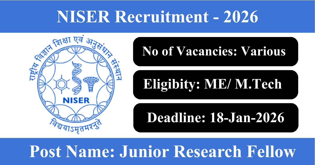 NISER Recruitment 2026: Apply for Various Junior Research Fellow vacancies. National Institute of Science Education and Research invited applications from eligible and interested candidates to fill up Junior Research Fellow Posts through NISER official notification January 2026. Job seekers who are looking for a career in Khordha – Odisha Government can make use of this opportunity. Interested candidates can send an E-Mail on or before 18-Jan-2026