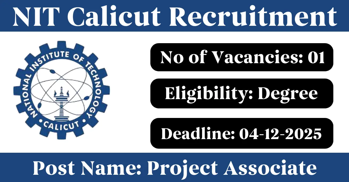 NIT Calicut Recruitment 2025: Apply for 1 Project Associate-I vacancies. National Institute of Technology Calicut invited applications from eligible and interested candidates to fill up Project Associate-I Posts through NIT Calicut official notification November 2025. Job seekers who are looking for a career in Calicut – Kerala Government can make use of this opportunity. Interested candidates can send an E-Mail on or before 04-Dec-2025
