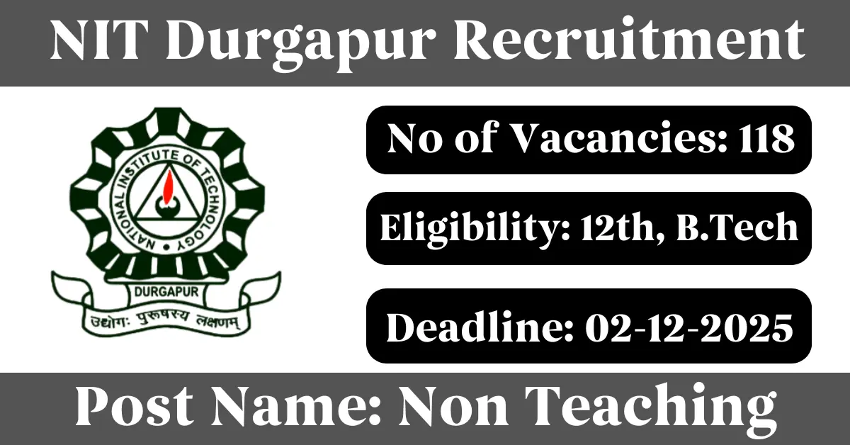 NIT Durgapur Recruitment 2025: Apply for 118 Non Teaching vacancies. National Institute of Technology Durgapur invited applications from eligible and interested candidates to fill up Non Teaching Posts through NIT Durgapur official notification November 2025. Job seekers who are looking for a career in Durgapur – West Bengal Government can make use of this opportunity. Interested candidates can Apply Online on or before 02-Dec-2025