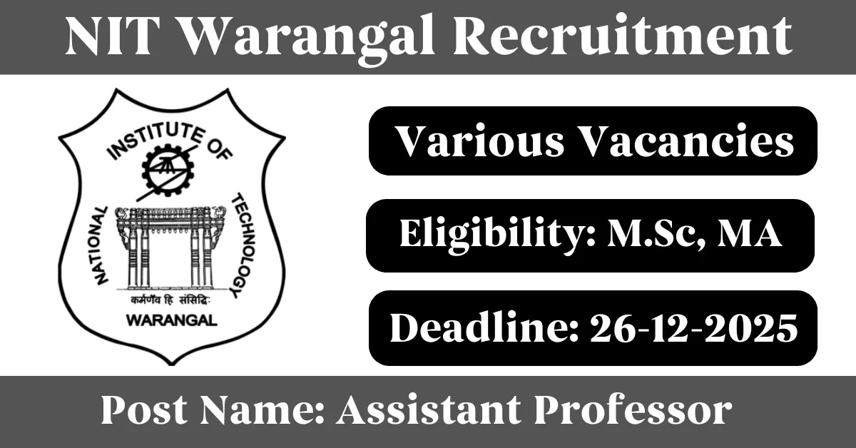 NIT Warangal Recruitment 2025: Apply for Various Visiting/ Part-Time Assistant Professor vacancies. National Institute of Technology Warangal invited applications from eligible and interested candidates to fill up Visiting/ Part-Time Assistant Professor Posts through NIT Warangal official notification December 2025. Job seekers who are looking for a career in Warangal – Telangana Government can make use of this opportunity. Interested candidates can attend for Walk-in-interview on 26-Dec-2025