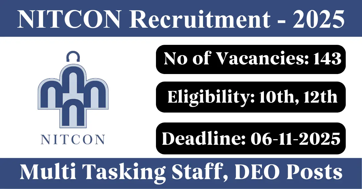 NITCON Recruitment 2025: Apply for 143 Multi Tasking Staff, DEO vacancies. NITCON Limited invited applications from eligible and interested candidates to fill up Multi Tasking Staff, DEO Posts through NITCON official notification November 2025. Job seekers who are looking for a career in Delhi – New Delhi Government can make use of this opportunity. Interested candidates can Apply Online on or before 06-Nov-2025