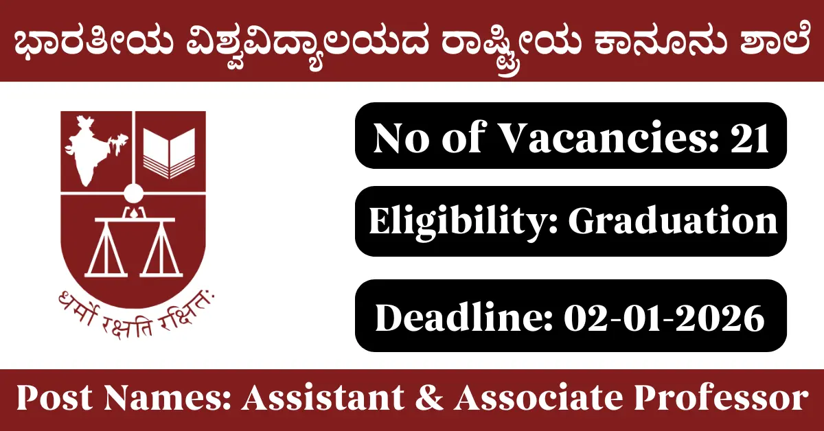 NLSIU Recruitment 2025: Apply for 21 Assistant Professor vacancies. The National Law School of India University invited applications from eligible and interested candidates to fill up Assistant Professor Posts through NLSIU official notification November 2025. Job seekers who are looking for a career in Bengaluru – Karnataka Government can make use of this opportunity. Interested candidates can Apply Online on or before 02-Jan-2026