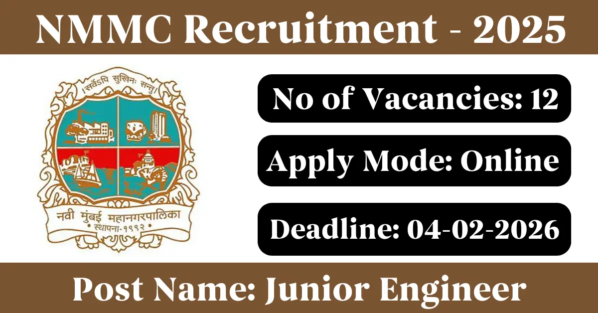 NMMC Recruitment 2025: Apply for 12 Junior Engineer vacancies. Navi Mumbai Municipal Corporation invited applications from eligible and interested candidates to fill up Junior Engineer Posts through NMMC official notification December 2025. Job seekers who are looking for a career in Mumbai – Maharashtra Government can make use of this opportunity. Interested candidates can Apply Online on or before 04-Feb-2026