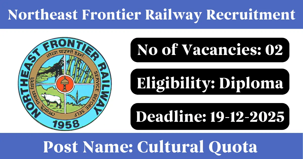 Northeast Frontier Railway Recruitment 2025: Apply for 2 Cultural Quota vacancies. Northeast Frontier Railway invited applications from eligible and interested candidates to fill up Cultural Quota Posts through Northeast Frontier Railway official notification November 2025. Job seekers who are looking for a career in Guwahati – Assam Government can make use of this opportunity. Interested candidates can Apply Offline on or before 19-Dec-2025