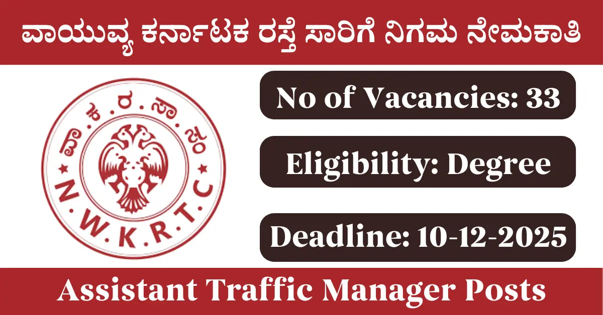NWKRTC Recruitment 2025: Apply for 33 Assistant Traffic Manager vacancies. North Western Karnataka Road Transport Corporation invited applications from eligible and interested candidates to fill up Assistant Traffic Manager Posts through NWKRTC official notification November 2025. Job seekers who are looking for a career in Karnataka Government can make use of this opportunity. Interested candidates can Apply Online on or before 10-Dec-2025