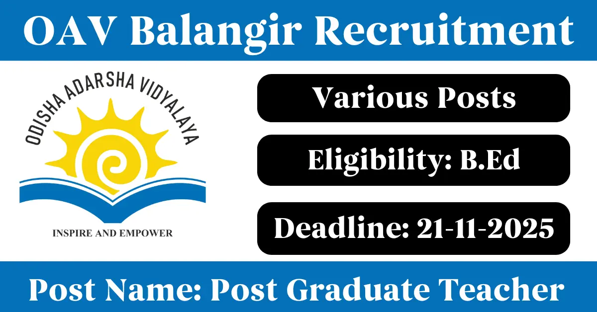 OAV Balangir Recruitment 2025: Apply for Various PGT vacancies. Odisha Adarsha Vidyalaya Balangir invited applications from eligible and interested candidates to fill up PGT Posts through OAV Balangir official notification November 2025. Job seekers who are looking for a career in Balangir – Odisha Government can make use of this opportunity. Interested candidates can attend for Walk-in-interview on 21-Nov-2025