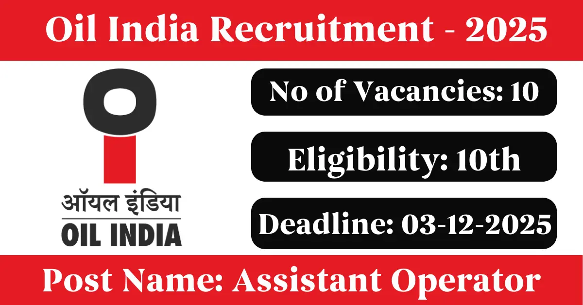 Oil India Recruitment 2025: Apply for 10 Assistant Operator vacancies. Oil India Limited invited applications from eligible and interested candidates to fill up Assistant Operator Posts through Oil India official notification November 2025. Job seekers who are looking for a career in Duliajan – Assam Government can make use of this opportunity. Interested candidates can attend for Walk-in-interview on 03-Dec-2025