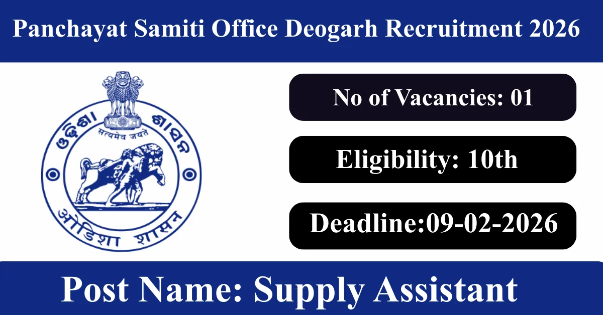 Panchayat Samiti Office Deogarh Recruitment 2026: Apply for 1 Supply Assistant vacancies. Panchayat Samiti Office Deogarh invited applications from eligible and interested candidates to fill up Supply Assistant Posts through Panchayat Samiti Office Deogarh official notification January 2026. Job seekers who are looking for a career in Deogarh – Odisha Government can make use of this opportunity. Interested candidates can Apply Offline on or before 09-Feb-2026