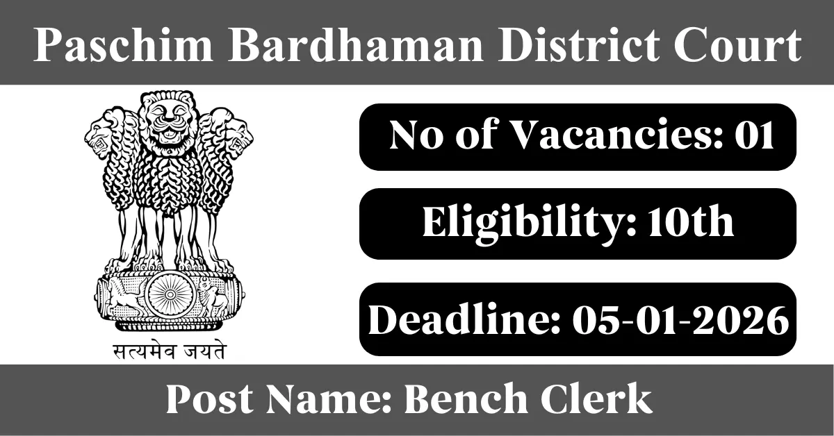 Paschim Bardhaman District Court Recruitment 2025: Apply for 1 Bench Clerk vacancies. Paschim Bardhaman eCourt invited applications from eligible and interested candidates to fill up Bench Clerk Posts through Paschim Bardhaman District Court official notification December 2025. Job seekers who are looking for a career in Paschim Bardhaman – West Bengal Government can make use of this opportunity. Interested candidates can Apply Offline on or before 05-Jan-2026