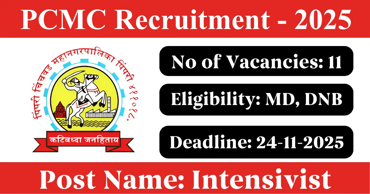 PCMC Recruitment 2025: Apply for 11 Intensivist vacancies. Pimpri Chinchwad Municipal Corporation invited applications from eligible and interested candidates to fill up Intensivist Posts through PCMC official notification November 2025. Job seekers who are looking for a career in Pune – Maharashtra Government can make use of this opportunity. Interested candidates can attend for Walk-in-interview on 24-Nov-2025