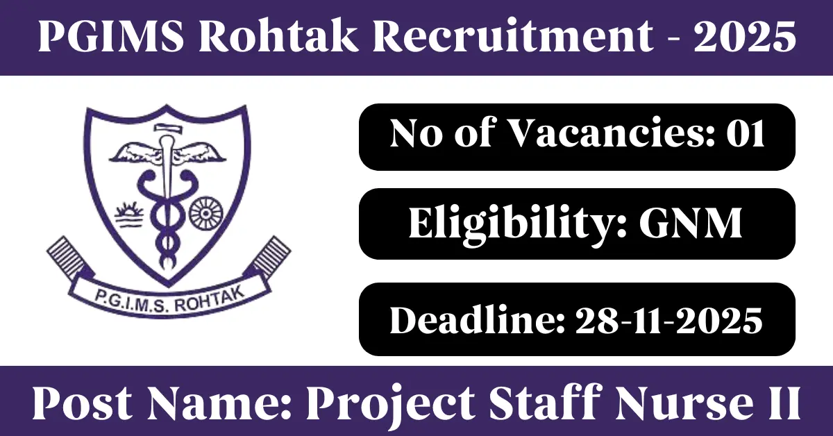 PGIMS Rohtak Recruitment 2025: Apply for 1 Project Staff Nurse II vacancies. Pandit Bhagwat Dayal Sharma Post Graduate Institute of Medical Sciences Rohtak invited applications from eligible and interested candidates to fill up Project Staff Nurse II Posts through PGIMS Rohtak official notification November 2025. Job seekers who are looking for a career in Rohtak – Haryana Government can make use of this opportunity. Interested candidates can Apply Offline on or before 28-Nov-2025