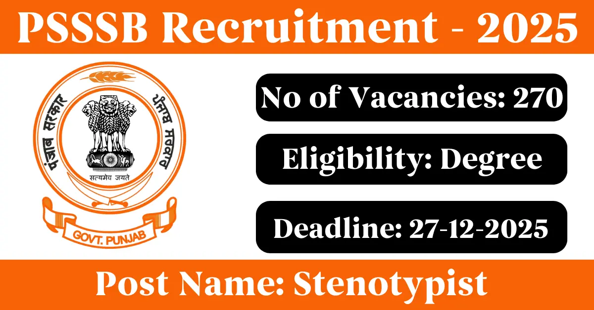 PSSSB Recruitment 2025: Apply for 270 Stenotypist vacancies. Punjab Subordinate Service Selection Board invited applications from eligible and interested candidates to fill up Stenotypist Posts through PSSSB official notification November 2025. Job seekers who are looking for a career in Punjab Government can make use of this opportunity. Interested candidates can Apply Online on or before 27-Dec-2025