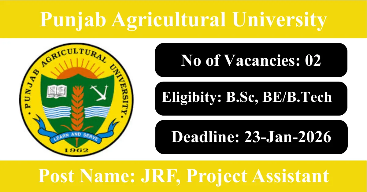 Punjab Agricultural University Recruitment 2026: Apply for 2 JRF, Project Assistant vacancies. Punjab Agricultural University invited applications from eligible and interested candidates to fill up JRF, Project Assistant Posts through Punjab Agricultural University official notification January 2026. Job seekers who are looking for a career in Ludhiana – Punjab Government can make use of this opportunity. Interested candidates can Apply Offline on or before 23-Jan-2026