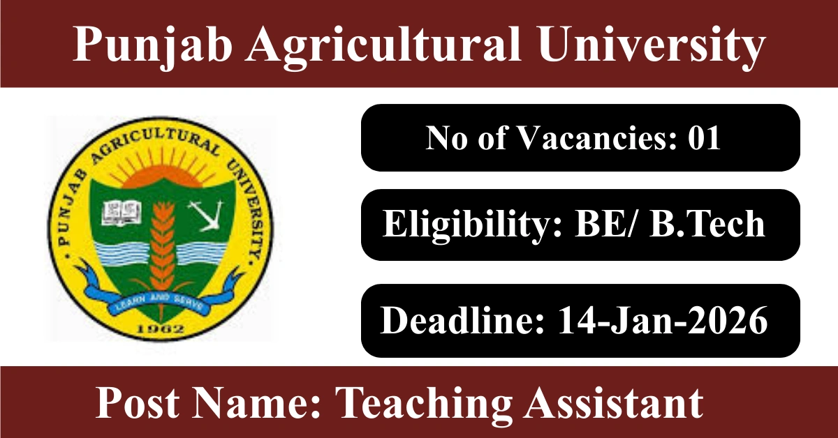 Punjab Agricultural University Recruitment 2026: Apply for 1 Teaching Assistant vacancies. Punjab Agricultural University invited applications from eligible and interested candidates to fill up Teaching Assistant Posts through Punjab Agricultural University official notification December 2025. Job seekers who are looking for a career in Ludhiana – Punjab Government can make use of this opportunity. Interested candidates can Apply Offline on or before 14-Jan-2026