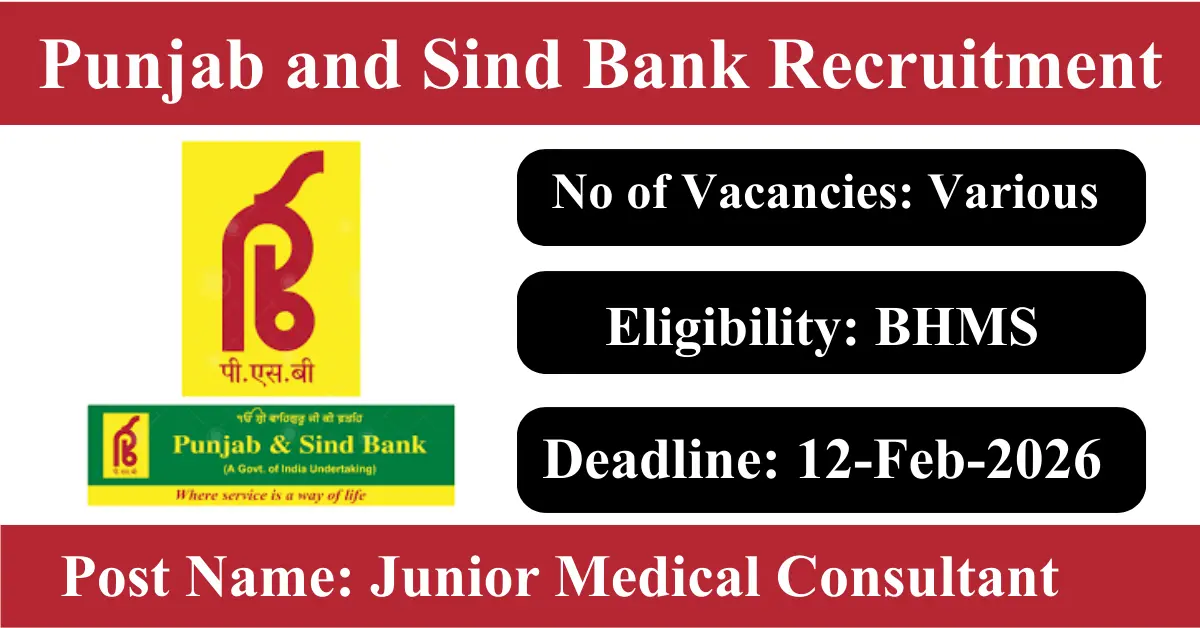 Punjab and Sind Bank Recruitment 2026: Apply for Various Medical Consultant vacancies. Punjab and Sind Bank invited applications from eligible and interested candidates to fill up Medical Consultant Posts through Punjab and Sind Bank official notification December 2025. Job seekers who are looking for a career in Gurugram – Haryana Government can make use of this opportunity. Interested candidates can Apply Offline on or before 12-Feb-2026