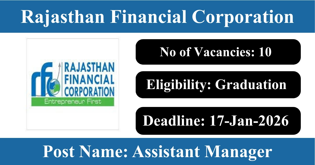 Rajasthan Financial Corporation Recruitment 2026: Apply for 10 Assistant Manager vacancies. Rajasthan Financial Corporation invited applications from eligible and interested candidates to fill up Assistant Manager Posts through Rajasthan Financial Corporation official notification January 2026. Job seekers who are looking for a career in Jaipur – Rajasthan Government can make use of this opportunity. Interested candidates can Apply Online on or before 28-Jan-2026