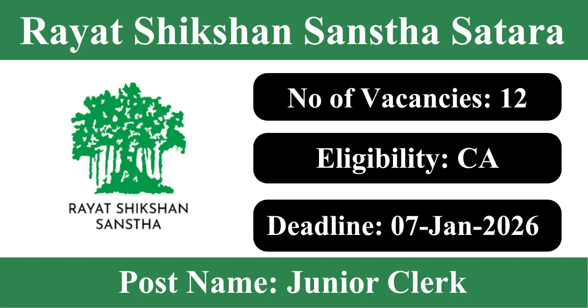 Rayat Shikshan Sanstha Satara Recruitment 2026: Apply for 12 Junior Clerk, Chief Auditor vacancies. Rayat Shikshan Sanstha Satara invited applications from eligible and interested candidates to fill up Junior Clerk, Chief Auditor Posts through Rayat Shikshan Sanstha Satara official notification December 2025. Job seekers who are looking for a career in Satara – Maharashtra Government can make use of this opportunity. Interested candidates can Apply Online on or before 07-Jan-2026