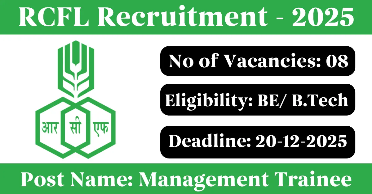 RCFL Recruitment 2025: Apply for 8 Management Trainee vacancies. Rashtriya Chemicals and Fertilizers Limited invited applications from eligible and interested candidates to fill up Management Trainee Posts through RCFL official notification December 2025. Job seekers who are looking for a career in Raigad, Mumbai – Maharashtra Government can make use of this opportunity. Interested candidates can Apply Online on or before 20-Dec-2025