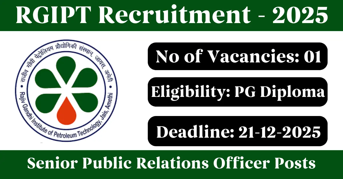 RGIPT Recruitment 2025: Apply for 01 Senior Public Relations Officer vacancies. Rajiv Gandhi Institute of Petroleum Technology invited applications from eligible and interested candidates to fill up Senior Public Relations Officer Posts through RGIPT official notification December 2025. Job seekers who are looking for a career in Amethi – Uttar Pradesh Government can make use of this opportunity. Interested candidates can Apply Online on or before 21-Dec-2025