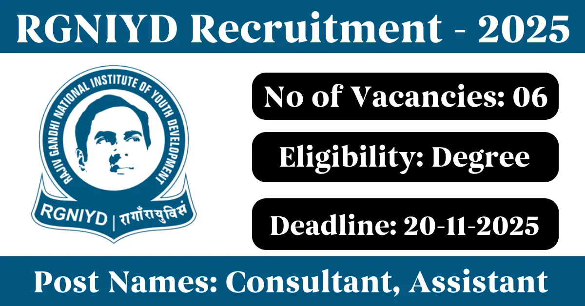RGNIYD Recruitment 2025: Apply for 6 Consultant, Assistant vacancies. Rajiv Gandhi National Institute of Youth Development invited applications from eligible and interested candidates to fill up Consultant, Assistant Posts through RGNIYD official notification November 2025. Job seekers who are looking for a career in Kancheepuram – Tamil Nadu Government can make use of this opportunity. Interested candidates can Apply Offline on or before 20-Nov-2025