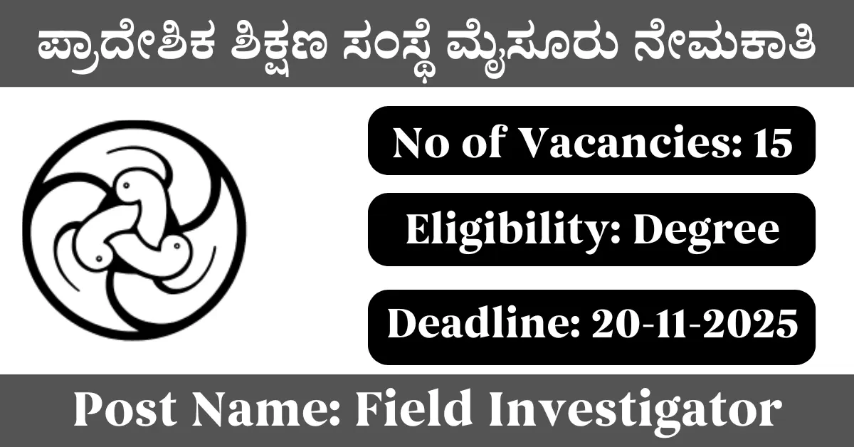 RIE Mysore Recruitment 2025: Apply for 15 Field Investigator vacancies. Regional Institute of Education Mysore invited applications from eligible and interested candidates to fill up Field Investigator Posts through RIE Mysore official notification November 2025. Job seekers who are looking for a career in Mysuru – Karnataka Government can make use of this opportunity. Interested candidates can attend for Walk-in-interview on 20-Nov-2025