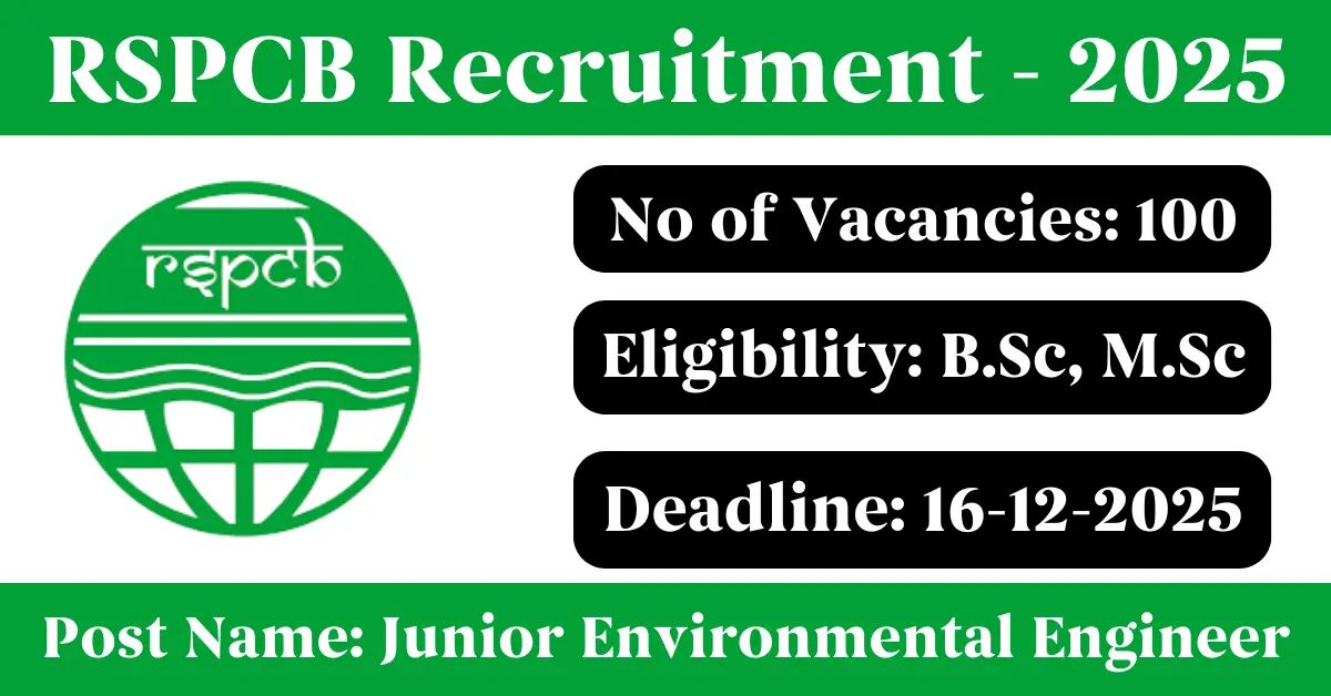 RSPCB Recruitment 2025: Apply for 100 Junior Environmental Engineer vacancies. Rajasthan State Pollution Control Board invited applications from eligible and interested candidates to fill up Junior Environmental Engineer Posts through RSPCB official notification November 2025. Job seekers who are looking for a career in Rajasthan Government can make use of this opportunity. Interested candidates can Apply Online on or before 16-Dec-2025