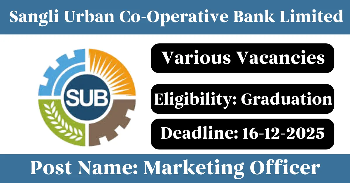 Sangli Urban Bank Recruitment 2025: Apply for Various Marketing Officer vacancies. Sangli Urban Co-Operative Bank Limited invited applications from eligible and interested candidates to fill up Marketing Officer Posts through Sangli Urban Bank official notification December 2025. Job seekers who are looking for a career in Sangli, Kolhapur – Maharashtra Government can make use of this opportunity. Interested candidates can Apply Offline on or before 16-Dec-2025