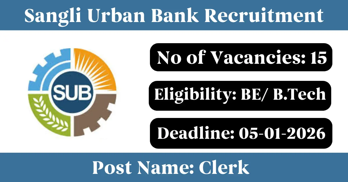 Sangli Urban Bank Recruitment 2026: Apply for 15 Clerk vacancies. Sangli Urban Co-Operative Bank Limited invited applications from eligible and interested candidates to fill up Clerk Posts through Sangli Urban Bank official notification December 2025. Job seekers who are looking for a career in Sangli – Maharashtra Government can make use of this opportunity. Interested candidates can Apply Online on or before 05-Jan-2026