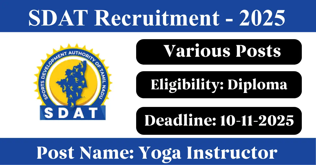 SDAT Recruitment 2025: Apply for Various Yoga Instructor vacancies. Sports Development Authority of Tamilnadu invited applications from eligible and interested candidates to fill up Yoga Instructor Posts through SDAT official notification November 2025. Job seekers who are looking for a career in Salem – Tamil Nadu Government can make use of this opportunity. Interested candidates can Apply Offline on or before 10-Nov-2025