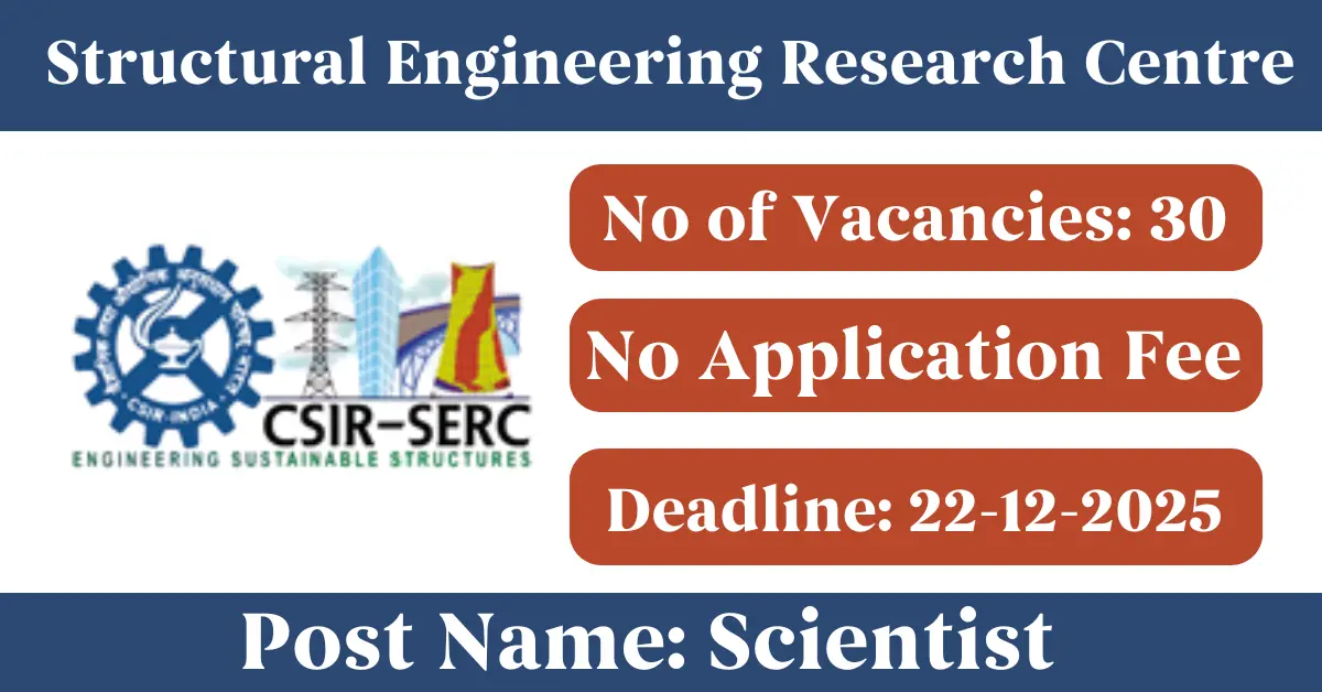 SERC Recruitment 2025: Apply for 30 Scientist vacancies. Structural Engineering Research Centre invited applications from eligible and interested candidates to fill up Scientist Posts through SERC official notification November 2025. Job seekers who are looking for a career in Chennai – Tamil Nadu Government can make use of this opportunity. Interested candidates can Apply Online on or before 22-Dec-2025