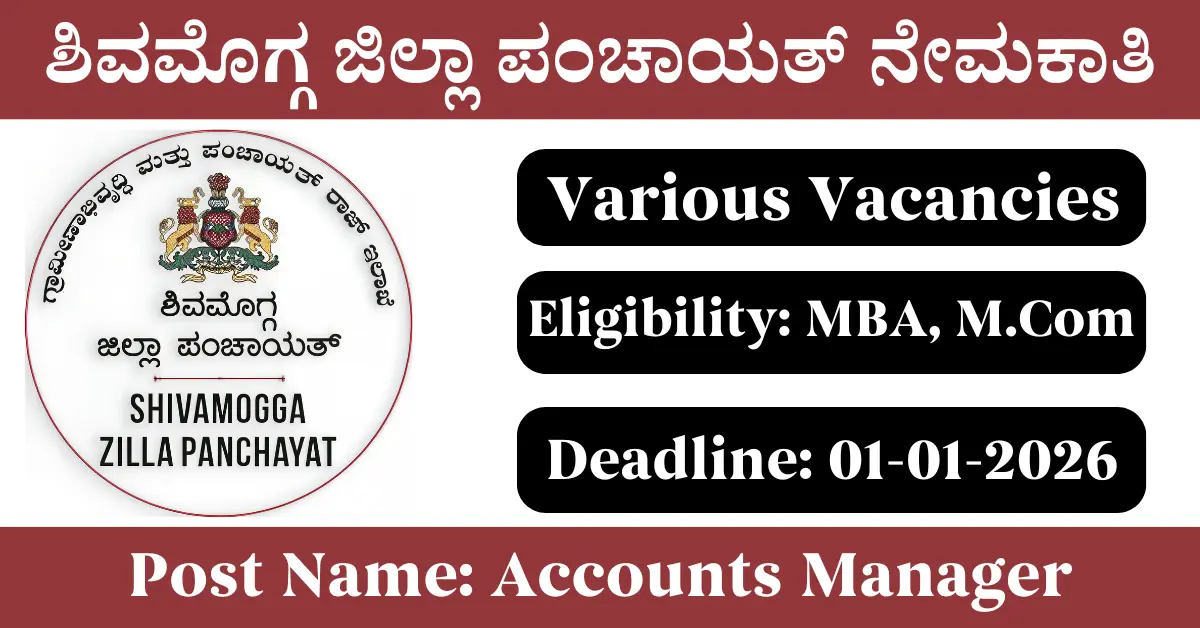 Shivamogga Zilla Panchayat Recruitment 2025: Apply for Various Accounts Manager vacancies. Shivamogga Zilla Panchayat invited applications from eligible and interested candidates to fill up Accounts Manager Posts through Shivamogga Zilla Panchayat official notification December 2025. Job seekers who are looking for a career in Shivamogga – Karnataka Government can make use of this opportunity. Interested candidates can Apply Online on or before 01-Jan-2026