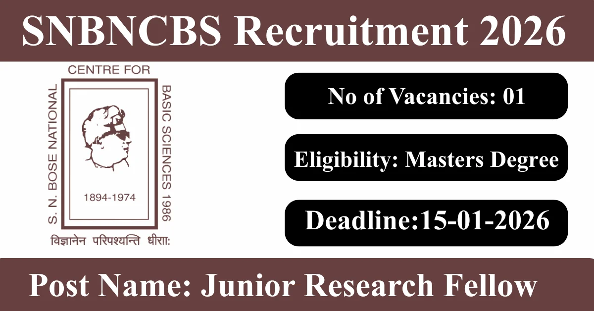 SNBNCBS Recruitment 2026: Apply for 1 Junior Research Fellow vacancies. Satyendra Nath Bose National Centre for Basic Sciences invited applications from eligible and interested candidates to fill up Junior Research Fellow Posts through SNBNCBS official notification January 2026. Job seekers who are looking for a career in Kolkata – West Bengal Government can make use of this opportunity. Interested candidates can Apply Offline on or before 15-Jan-2026