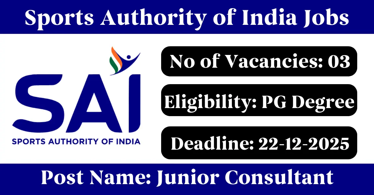 Sports Authority of India Recruitment 2025: Apply for 03 Junior Consultant vacancies. Sports Authority of India invited applications from eligible and interested candidates to fill up Junior Consultant Posts through Sports Authority of India official notification December 2025. Job seekers who are looking for a career in Delhi – New Delhi Government can make use of this opportunity. Interested candidates can send an E-Mail on or before 22-Dec-2025