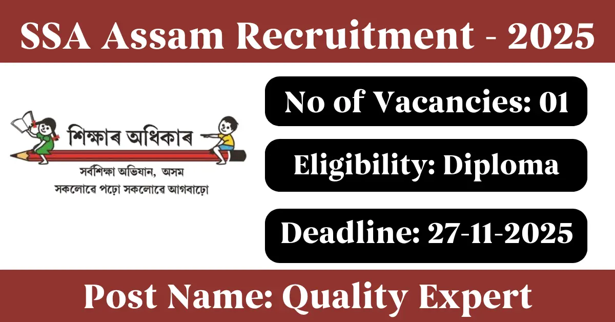 SSA Assam Recruitment 2025: Apply for 1 Quality Expert vacancies. Samagra Shiksha Axom Assam invited applications from eligible and interested candidates to fill up Quality Expert Posts through SSA Assam official notification November 2025. Job seekers who are looking for a career in Guwahati – Assam Government can make use of this opportunity. Interested candidates can Apply Online on or before 27-Nov-2025
