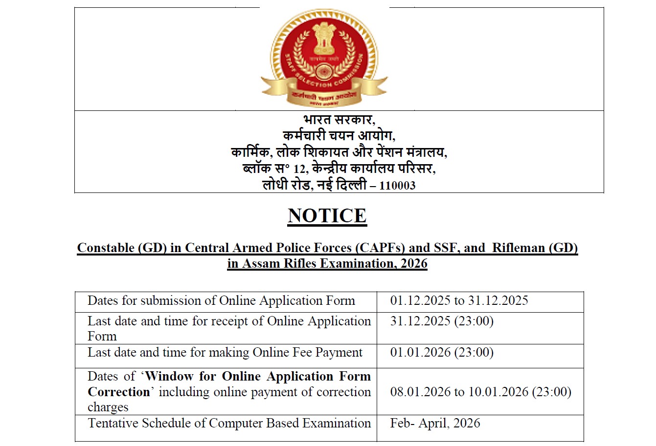 SSC Recruitment 2025 – 2026: Apply for 25487 General Duty (GD) Constable vacancies. Staff Selection Commission invited applications from eligible and interested candidates to fill up Constable (Constable GD in Central Armed Police Forces (CAPFs) and SSF, and Rifleman (GD) in Assam Rifles Examination, 2026) Posts through SSC official notification 01st December 2025. Job seekers who are looking for a career in SSC GD can make use of this opportunity. Interested candidates can Apply Online on or before 31-Dec-2025