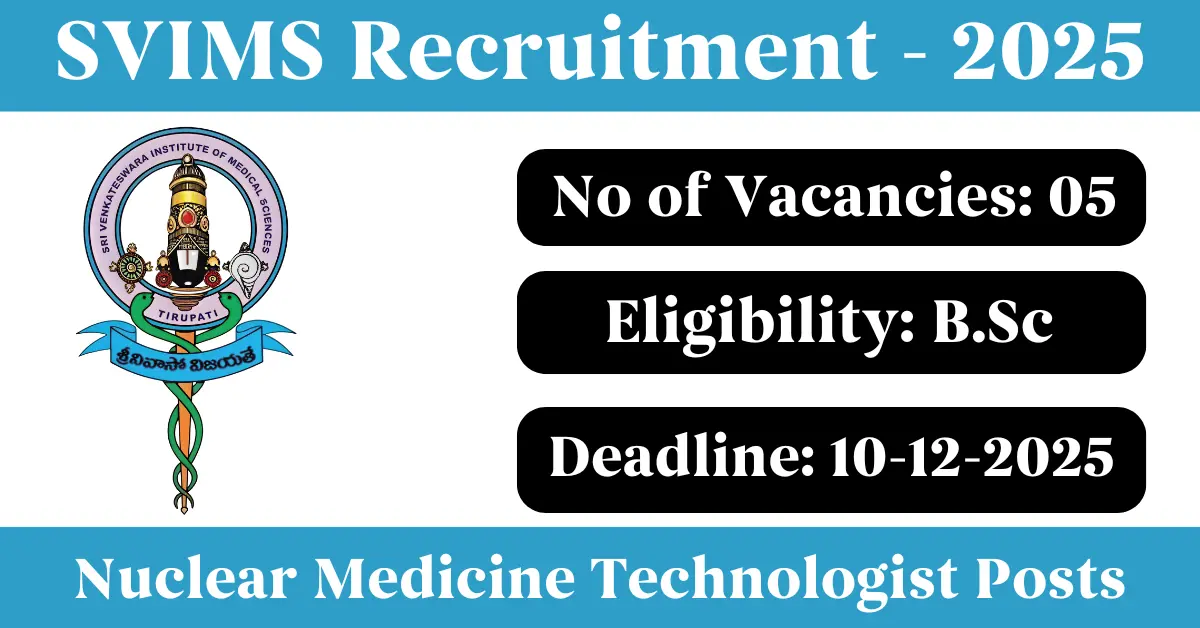 SVIMS Recruitment 2025: Apply for 5 Nuclear Medicine Technologist vacancies. Sri Venkateswara Institute of Medical Sciences invited applications from eligible and interested candidates to fill up Nuclear Medicine Technologist Posts through SVIMS official notification December 2025. Job seekers who are looking for a career in Tirupati – Andhra Pradesh Government can make use of this opportunity. Interested candidates can attend for Walk-in-interview on 10-Dec-2025