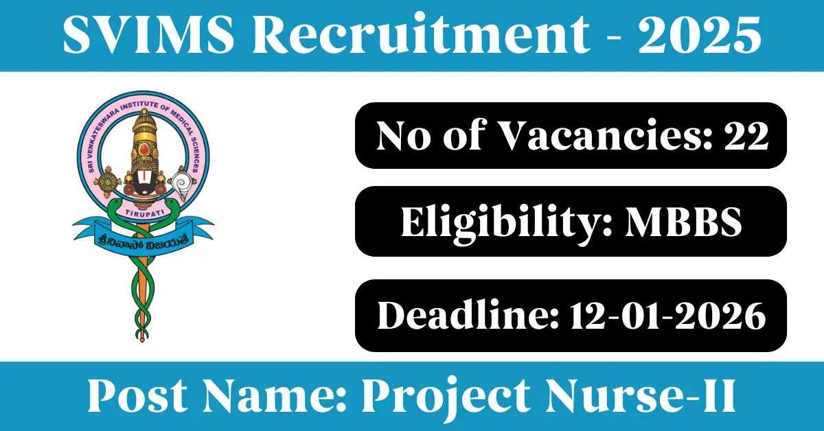 SVIMS Recruitment 2025: Apply for 22 Nurse vacancies. Sri Venkateswara Institute of Medical Sciences invited applications from eligible and interested candidates to fill up Nurse Posts through SVIMS official notification December 2025. Job seekers who are looking for a career in Tirupati – Andhra Pradesh Government can make use of this opportunity. Interested candidates can Apply Offline on or before 12-Jan-2026