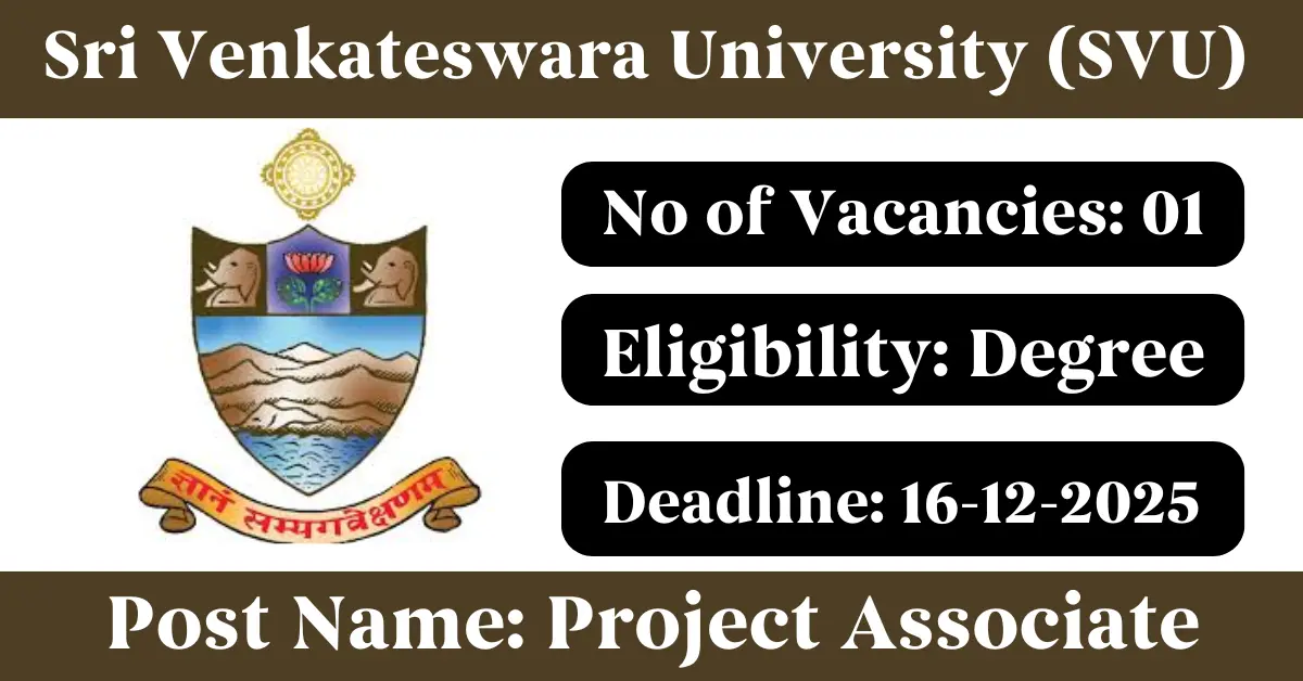 SVU Recruitment 2025: Apply for 41 Project Associate vacancies. Sri Venkateswara University invited applications from eligible and interested candidates to fill up Project Associate Posts through SVU official notification December 2025. Job seekers who are looking for a career in Tirupati – Andhra Pradesh Government can make use of this opportunity. Interested candidates can Apply Offline on or before 16-Dec-2025