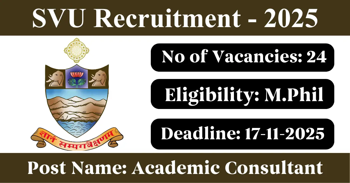 SVU Recruitment 2025: Apply for 24 Academic Consultant vacancies. Sri Venkateswara University invited applications from eligible and interested candidates to fill up Academic Consultant Posts through SVU official notification November 2025. Job seekers who are looking for a career in Tirupati – Andhra Pradesh Government can make use of this opportunity. Interested candidates can Apply Online on or before 17-Nov-2025