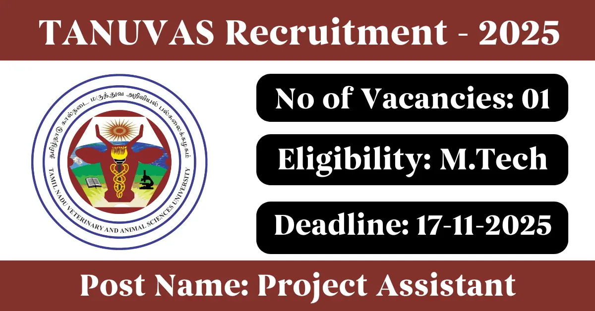 TANUVAS Recruitment 2025: Apply for 1 Project Assistant vacancies. Tamil Nadu Veterinary and Animal Sciences University invited applications from eligible and interested candidates to fill up Project Assistant Posts through TANUVAS official notification November 2025. Job seekers who are looking for a career in Chennai – Tamil Nadu Government can make use of this opportunity. Interested candidates can attend for Walk-in-interview on 17-Nov-2025