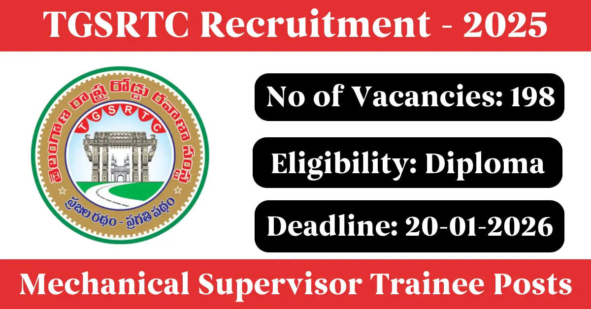 TGSRTC Recruitment 2025: Apply for 198 Mechanical Supervisor Trainee vacancies. Telangana State Road Transport Corporation invited applications from eligible and interested candidates to fill up Mechanical Supervisor Trainee Posts through TGSRTC official notification December 2025. Job seekers who are looking for a career in Telangana Government can make use of this opportunity. Interested candidates can Apply Online on or before 20-Jan-2026