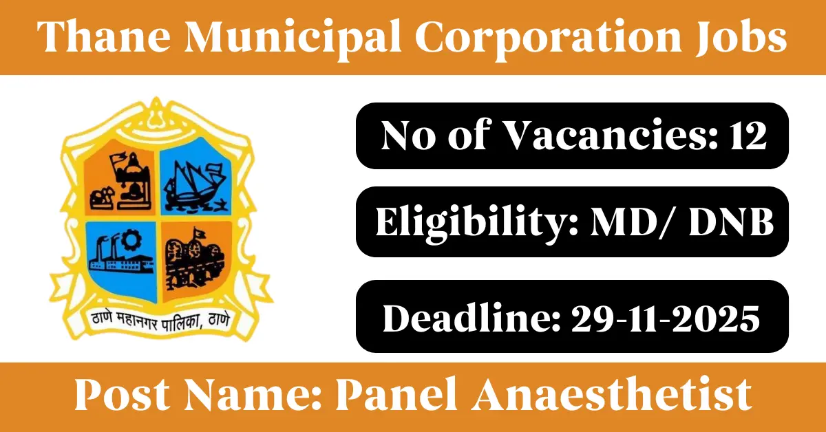 Thane Municipal Corporation Recruitment 2025: Apply for 12 Panel Anaesthetist vacancies. Thane Municipal Corporation invited applications from eligible and interested candidates to fill up Panel Anaesthetist Posts through Thane Municipal Corporation official notification November 2025. Job seekers who are looking for a career in Thane – Maharashtra Government can make use of this opportunity. Interested candidates can attend for Walk-in-interview on 29-Nov-2025