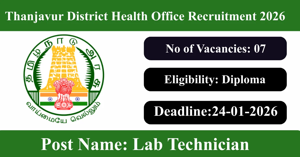 Thanjavur District Health Office Recruitment 2026: Apply for 7 Lab Technician vacancies. Thanjavur District Health Office invited applications from eligible and interested candidates to fill up Lab Technician Posts through Thanjavur District Health Office official notification January 2026. Job seekers who are looking for a career in Thanjavur – Tamil Nadu Government can make use of this opportunity. Interested candidates can Apply Offline on or before 24-Jan-2026