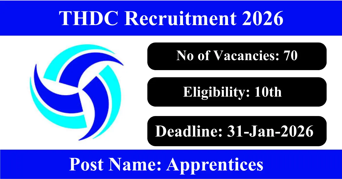 THDC Recruitment 2026: Apply for 70 Apprentices vacancies. Tehri Hydro Development Corporation Limited invited applications from eligible and interested candidates to fill up Apprentices Posts through THDC official notification December 2025. Job seekers who are looking for a career in Rishikesh – Uttarakhand Government can make use of this opportunity. Interested candidates can Apply Online/Offline on or before 31-Jan-2026
