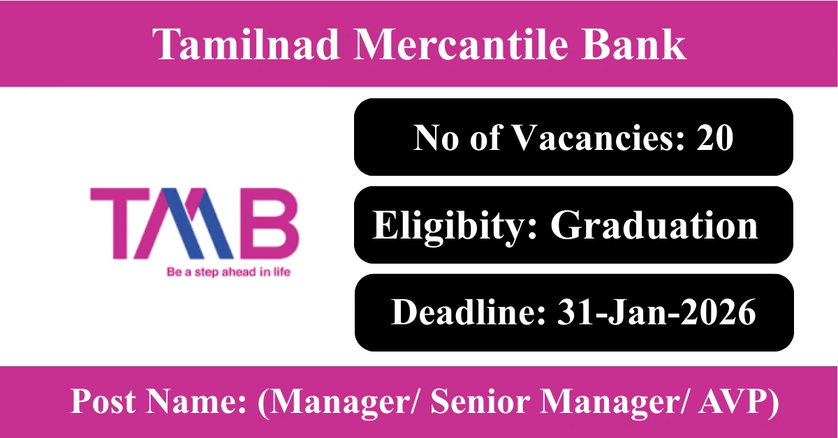 TMB Recruitment 2026: Apply for 20 Branch Heads (Manager/ Senior Manager/ AVP) vacancies. Tamilnad Mercantile Bank invited applications from eligible and interested candidates to fill up Branch Heads (Manager/ Senior Manager/ AVP) Posts through TMB official notification January 2026. Job seekers who are looking for a career in All India Government can make use of this opportunity. Interested candidates can Apply Online on or before 31-Jan-2026