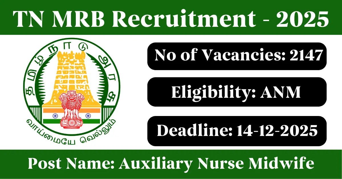 TN MRB Recruitment 2025: Apply for 2147 Auxiliary Nurse Midwife/ Village Health Nurse vacancies. Tamil Nadu Medical Services Recruitment Board invited applications from eligible and interested candidates to fill up Auxiliary Nurse Midwife/ Village Health Nurse Posts through TN MRB official notification November 2025. Job seekers who are looking for a career in Tamil Nadu Government can make use of this opportunity. Interested candidates can Apply Online on or before 14-Dec-2025