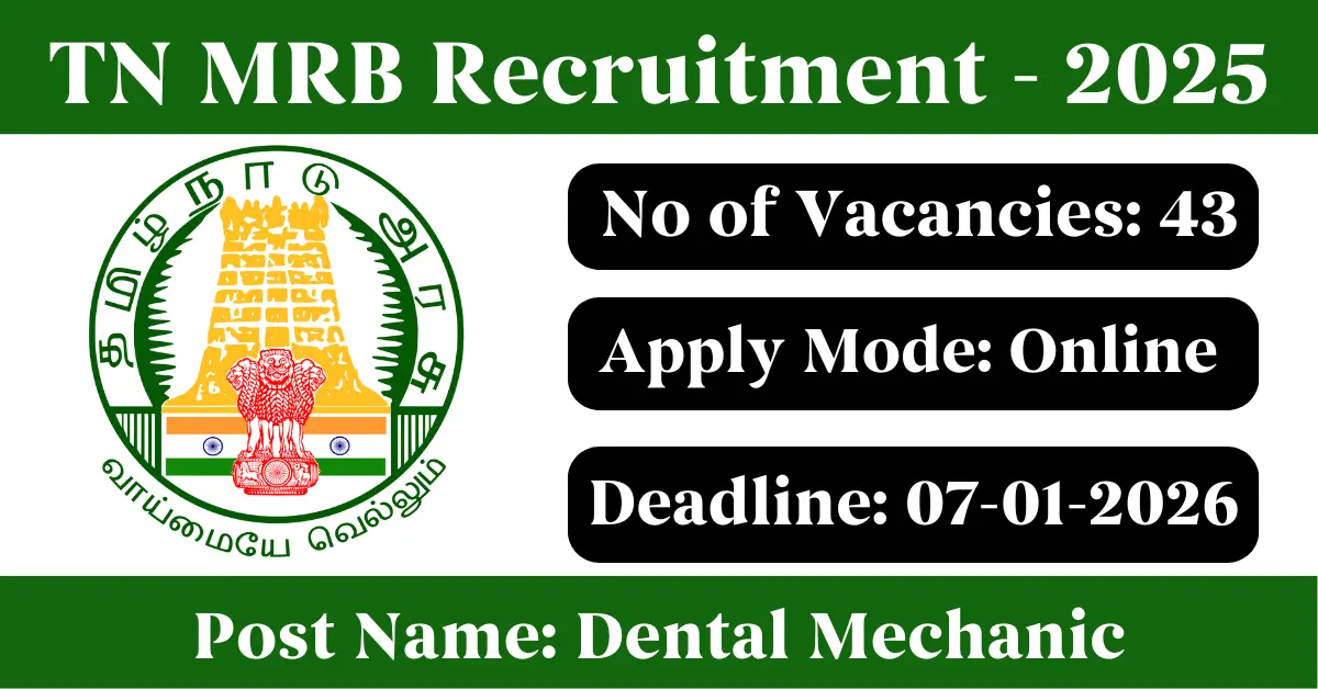 TN MRB Recruitment 2025: Apply for 43 Dental Mechanic vacancies. Tamil Nadu Medical Services Recruitment Board invited applications from eligible and interested candidates to fill up Dental Mechanic Posts through TN MRB official notification December 2025. Job seekers who are looking for a career in Tamil Nadu Government can make use of this opportunity. Interested candidates can Apply Online on or before 07-Jan-2026