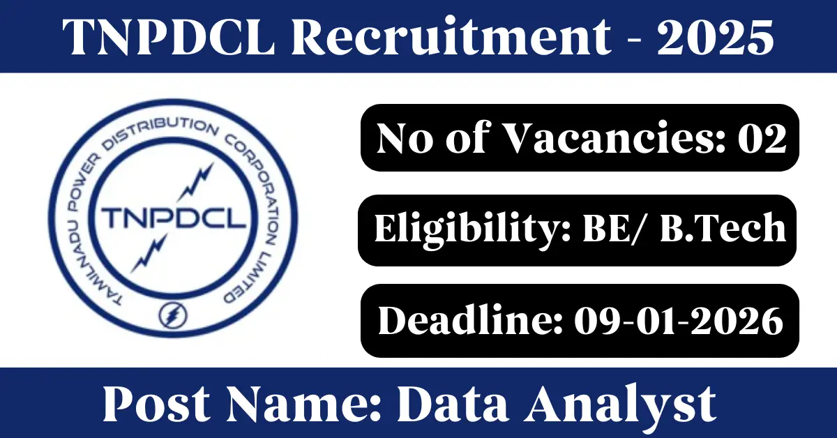 TNPDCL Recruitment 2025: Apply for 2 Data Analyst vacancies. Tamil Nadu Power Distribution Corporation Limited invited applications from eligible and interested candidates to fill up Data Analyst Posts through TNPDCL official notification December 2025. Job seekers who are looking for a career in Chennai – Tamil Nadu Government can make use of this opportunity. Interested candidates can Apply Offline on or before 09-Jan-2026
