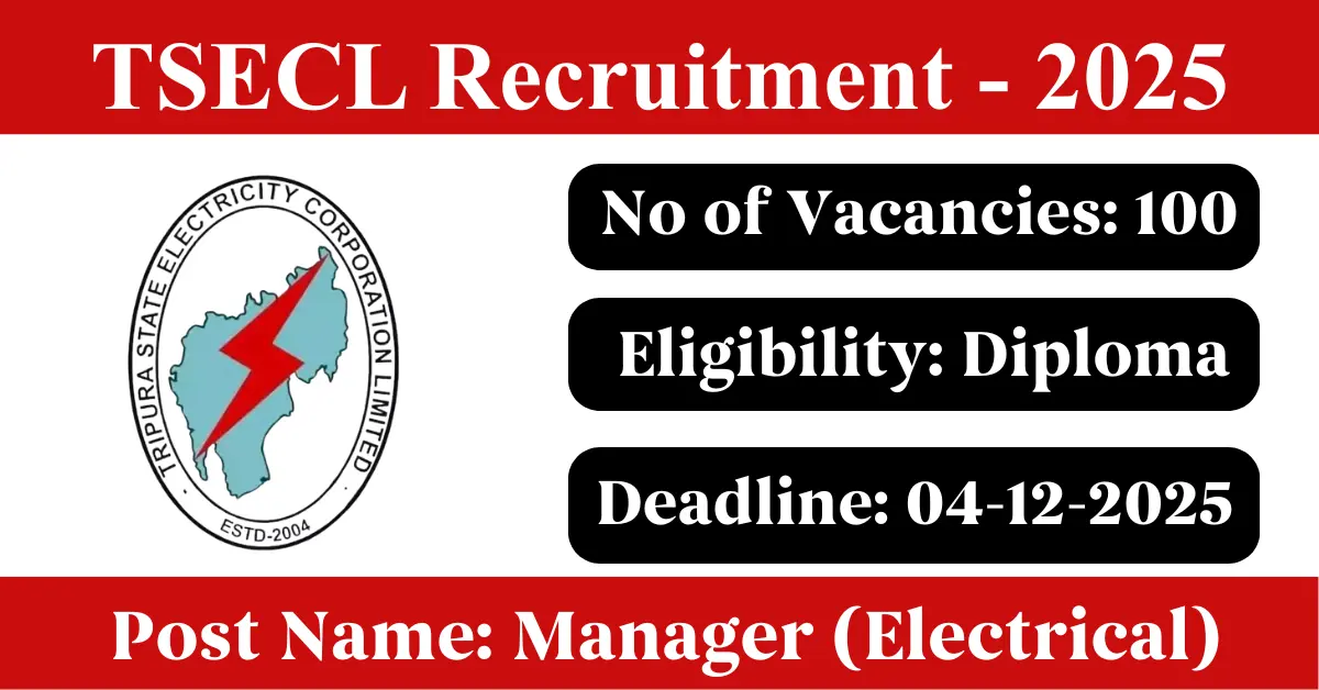 TSECL Recruitment 2025: Apply for 100 Manager vacancies. Tripura State Electricity Corporation Limited invited applications from eligible and interested candidates to fill up Manager Posts through TSECL official notification November 2025. Job seekers who are looking for a career in Tripura Government can make use of this opportunity. Interested candidates can Apply Offline on or before 04-Dec-2025