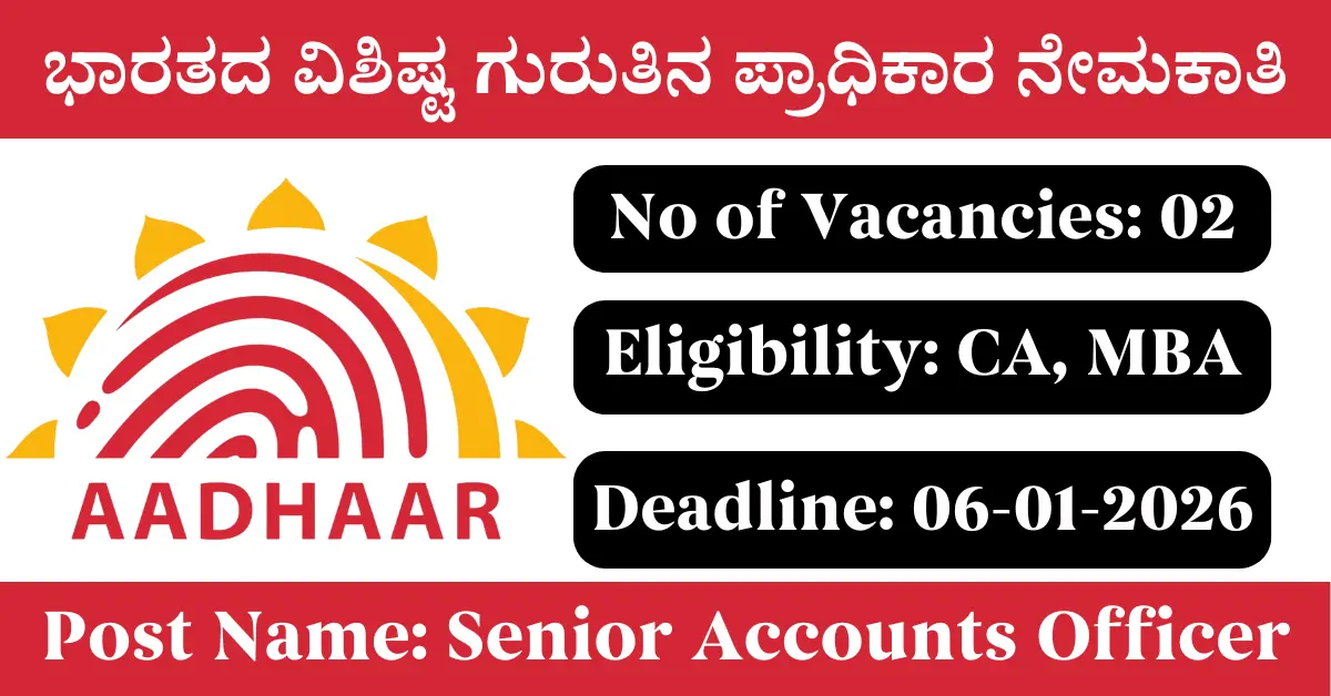 UIDAI Recruitment 2025: Apply for 2 Senior Accounts Officer vacancies. Unique Identification Authority of India invited applications from eligible and interested candidates to fill up Senior Accounts Officer Posts through UIDAI official notification November 2025. Job seekers who are looking for a career in Bengaluru – Karnataka Government can make use of this opportunity. Interested candidates can Apply Offline on or before 06-Jan-2026